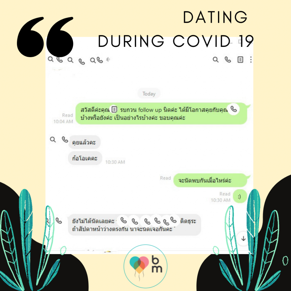 ดังนั้น คนโสดทั้งหลายไม่ต้องกังวลนะคะ ช่วง COVID แบบนี้ ทีมงานแม่สื่อของเรา ก็ยังมาทำงานกันตามปกติทุกวัน จับแมช และแลกเบอร์โทร แลกไลน์ ให้คู่เดทไปคุยทำความรู้จักกันค่ะ